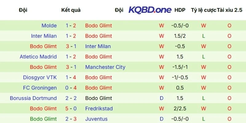 Thành tích ra sân gần nhất của Bodo Glimt